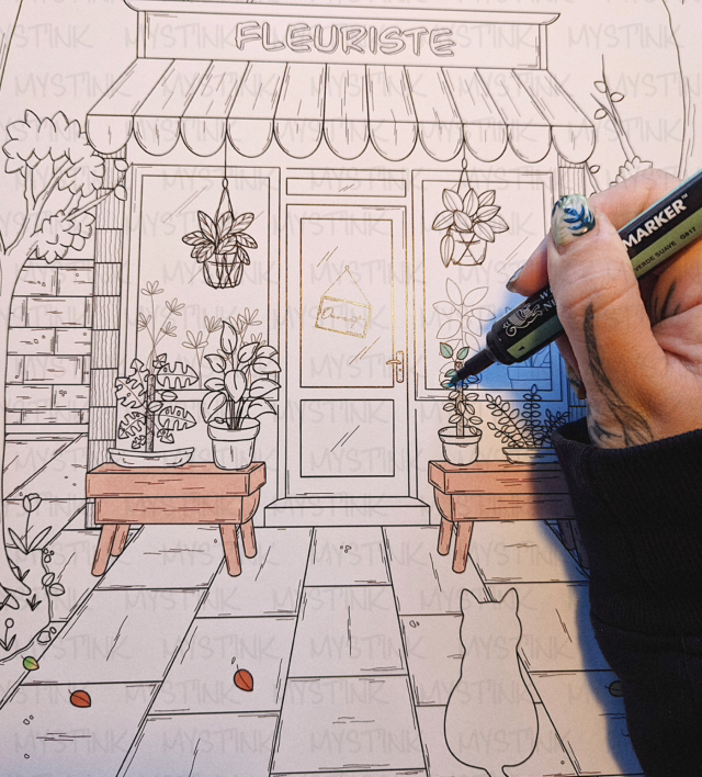 Mes affiches à colorier sont de petits univers à explorer : une boutique, un intérieur, un décor chaleureux, des ambiances riches en détails mais toujours harmonieuses, pour offrir un support qui invite à se poser et laisser votre créativité faire le reste.