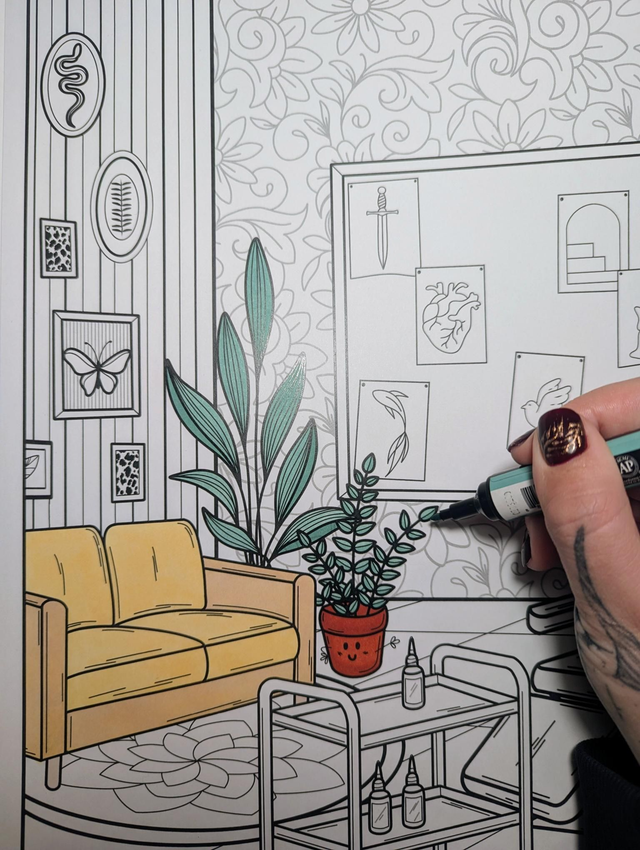 Mes affiches à colorier sont de petits univers à explorer : une boutique, un intérieur, un décor chaleureux, des ambiances riches en détails mais toujours harmonieuses, pour offrir un support qui invite à se poser et laisser votre créativité faire le reste.
